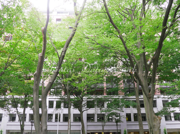 史跡名勝天然記念物のけやき並木沿いという好立地だからこそ、けやきの豊かな緑を借景として享受するために、エントランスホールは約18.2mものワイドな間口を確保しました。けやき並木を映すスクリーンとなるワイドなサッシュを施したエントランスホールは、天井高約2,550mmの開放的で広々としたスペース。床には高級ホテルを思わせる優雅な天然石調タイル、壁には部分的に天然石を施すことで、けやき並木の木漏れ日とともに自然の安らぎに包まれます。