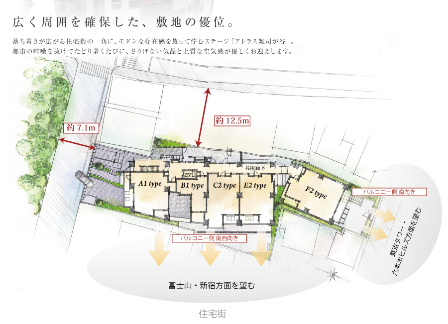 「アトラス雑司が谷」は2009年10月竣工、12階建、総戸数59戸からなるマンションです。落ち着きあるモノトーンのタイル貼りとオレンジカラーの縦ラインをアクセントとして取り入れた外観です。東の護国寺、西の神田川に広がってなだらかな傾斜がなす高台に位置しており、バルコニーからは一日の変化が手に取るように見晴らせる眺望がお楽しみいただけます。